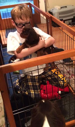 The first night we put her in a large crate with bedding, toys, and lots of kisses. She